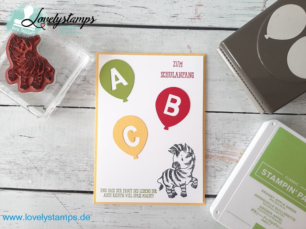 Natürlich musste mein Lieblingszebra aus dem neuen Stempelset “Zany Zebra” mit drauf ❤ und auch die Luftballon Stanze war mal wieder im Einsatz.