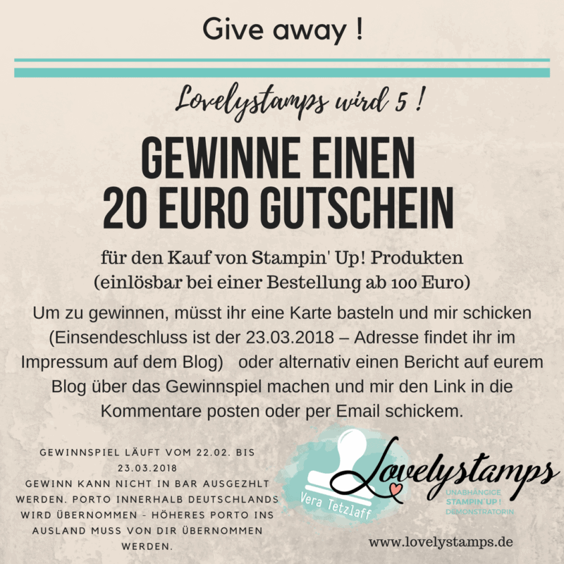 Wer eine Karte bastelt und diese bis zum 23.03.2018 zuschickt, hüpft ins Lostöpfchen und gewinnt einen 20 Euro Gutschein für eure nächste Stampin’ Up! Bestellung. Einfach oder?