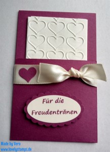 Taschentücher sind mit der Big Shot und der Prägeform Herzen jeweils einzeln von Hand geprägt worden. Die Papierverpackung wurde geschnitten, geklebt und gefalzt. Das Satinband darum geknotet und ein kleines Herz gestanzt und aufgeklebt. Sowie den Spruch gestempelt, gestanzt und auf das ausgestanzte Wellenoval geklebt.