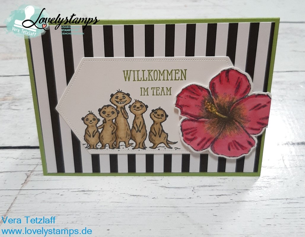 Die Erdmännchen liebe ich so sehr ❤ die mussten mit auf meine Karte. Das DSP ist aus der neuen Sale-a-bration Broschüre, das schwarz weiß goldene Bienen Papier.