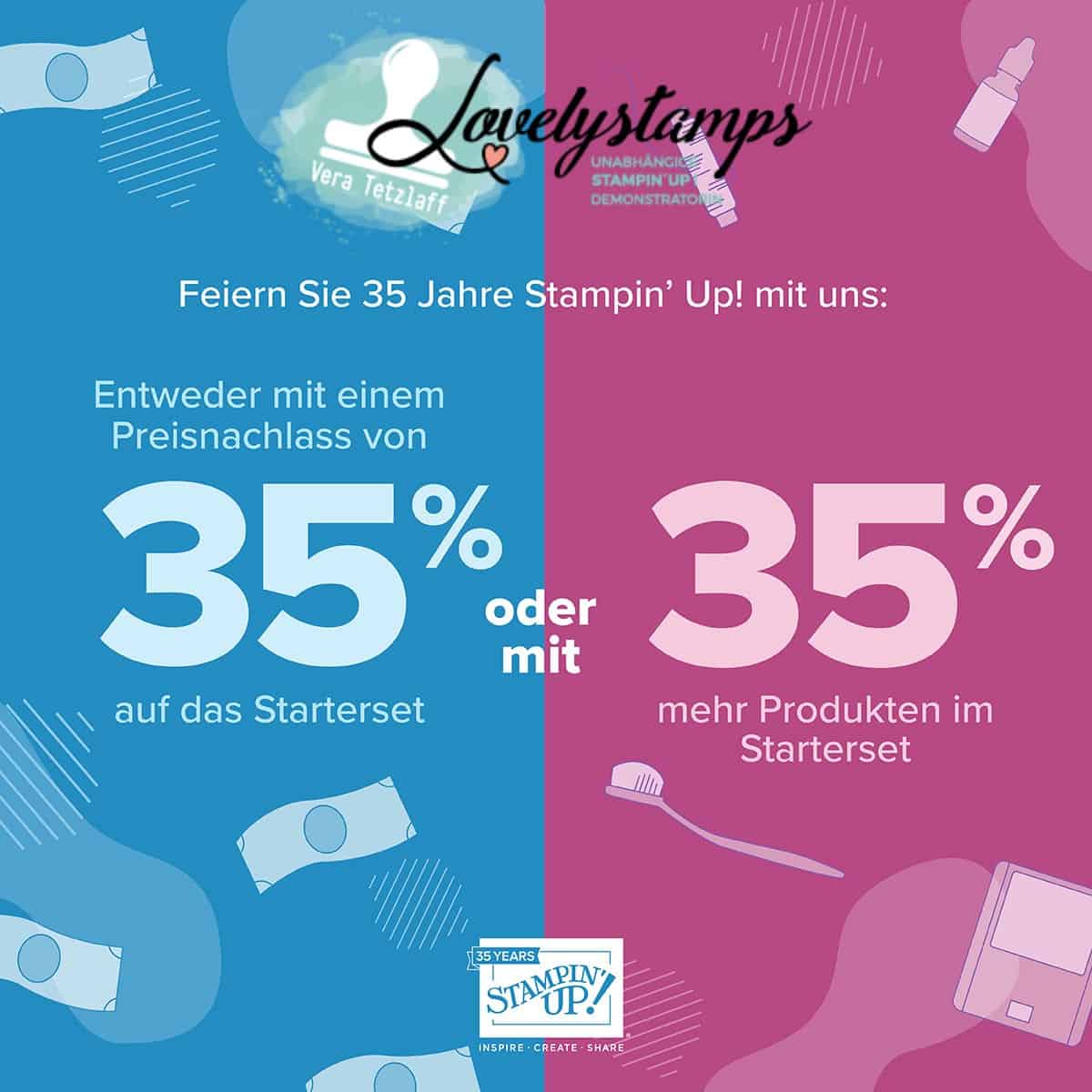 Stampin’ Up! bietet diesen Oktober wieder ein tolles Angebot selber Berater/in zu werden. Zum 35. Jubiläum von Stampin’ Up! gibt es entweder 35% Nachlass auf den Preis des Startersets oder es gibt 35% mehr Produkte im Starterset.