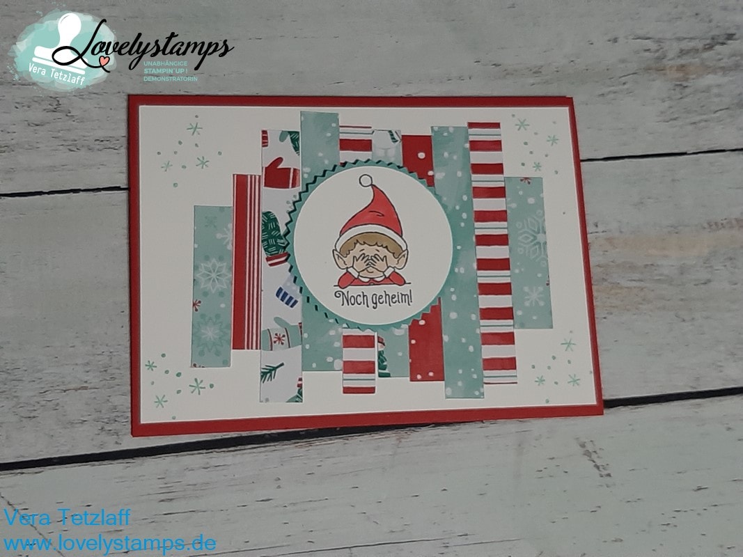 Weihnachtskarten gehen immer und daher habe ich hier eine Resteverwertungskarte gemacht. Schnipsel vom Designerpapier “Hurra es schneit” habe ich auf die Grundkarte in Flüsterweiß geklebt. Die Stanze Sonne und ein Kreis mit dem Elfen aus dem Set #Weihnachtself bestempelt und auch die kleinen Sterne auf der Grundkarte sind aus diesem Stempelset.