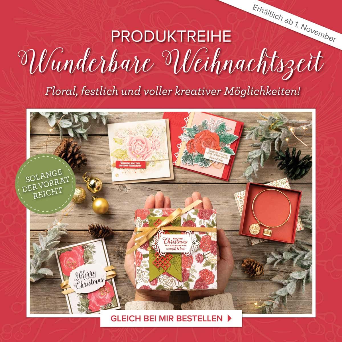 Seit Ihr bereit für eine zauberhafte Weihnachtszeit? Die Stampin’ Up! Produktreihe “Wunderbare Weihnachtszeit” wartet schon auf euch! Diese exklusive, nur für kurze Zeit erhältliche Kollektion besteht aus festlich-floralen, aufeinander abgestimmten Produkten.